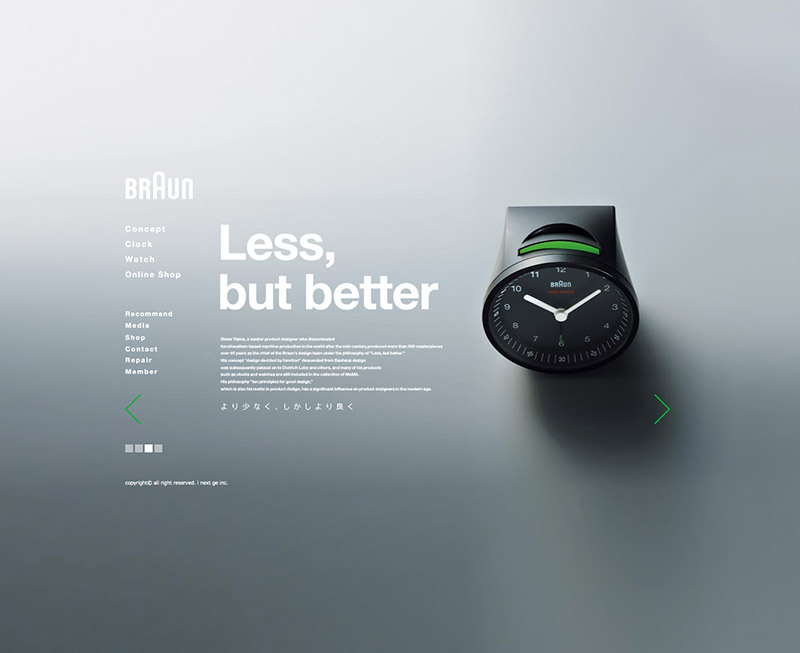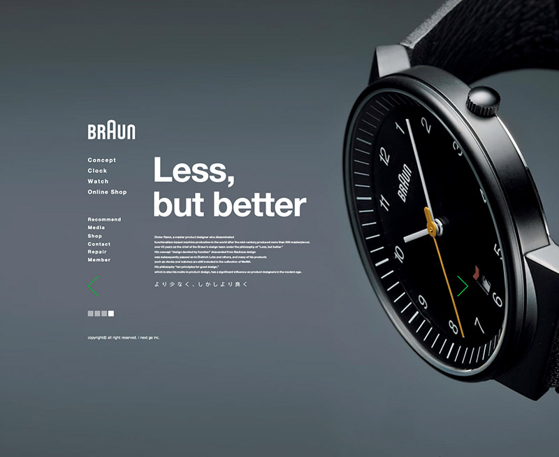 A perfect example of this are the designs of Braun and the treatment of these designs in on the Japanese version of Braun’s website as the cleanliness and simplicity speaks for itself. More, one critic has urged that the peaceful transition of images to functions of the site is THE basis for the tone that clearly sets these design objects apart from others in the market especially when the firm in question is a German design and manufacturing firm.